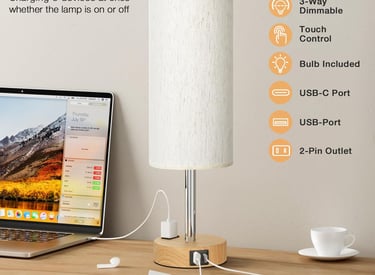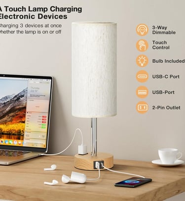 Fenmzee Bedside Table Lamp for Bedroom - 3 Way Dimmable Touch Lamp USB C Charging Ports and AC Outlet, Small Lamp Wood Base Round Flaxen Fabric Shade for Living Room, Desk, LED Bulb Included