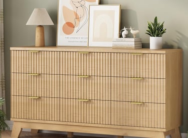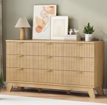 Fluted Dresser for Bedroom with 9 Drawers, 57" Wide Modern Chest of Drawers with Metal Handle, Wooden Dresser TV Stand, Wood Closet Clothes Storage Organizer for Living Room, Hallway, Natural Oak