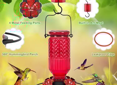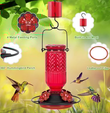 FEED GARDEN Glass Hummingbird Feeder, 16oz Outdoor Hanging Bird Feeder with Ant Moat, 4 Bee-Proof Feeding Ports, 360° Perch, Leak-Proof, Red