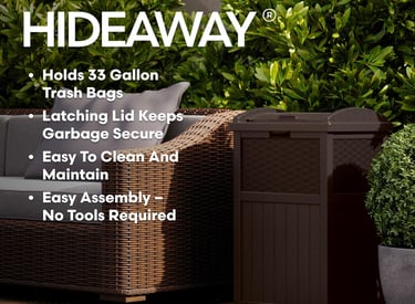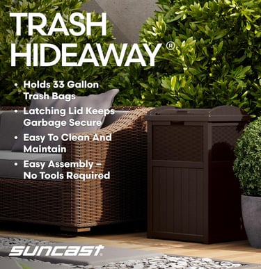 Suncast 33 Gallon Commercial Outdoor Trashcan Hideaway with Lid for 30 to 33 Gallon Trash Bags for Garage, Backyard, or Garden, Brown