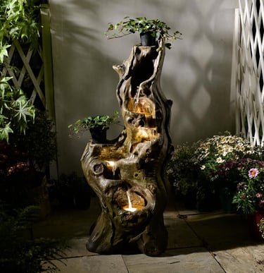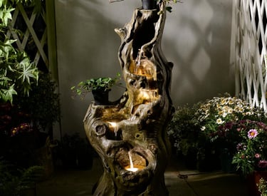Water Fountain Outdoor 5-Tiers Large Cascading Realistic Tree Trunk Natural Waterfall Outdoor Fountain Resin Imitation Wood with LED Lights for Garden, Patio, Porch
