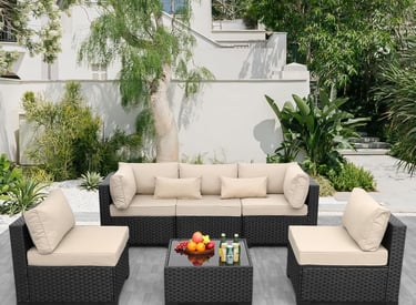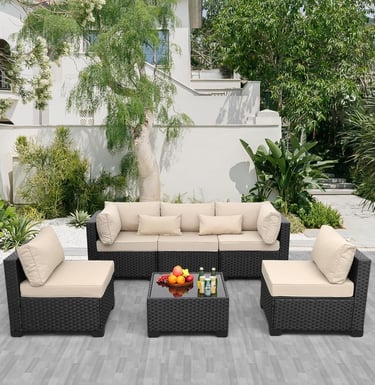 Rattaner Patio Sectional 6 Pieces All-Weather Wicker Patio Furniture Set Outdoor Sectional with Glass Table Non-Slip Cushions and Waterproof Cover, Khaki