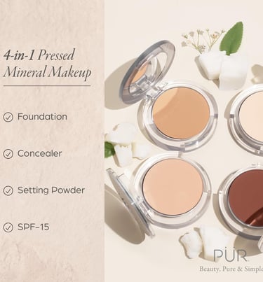 PÜR MINERALS 4-in-1 Pressed Mineral Makeup Powder Foundation with SPF 15 - Concealer & Finishing Compact Pressed Powder for Face - Buildable Medium to Full Coverage Foundation Powder
